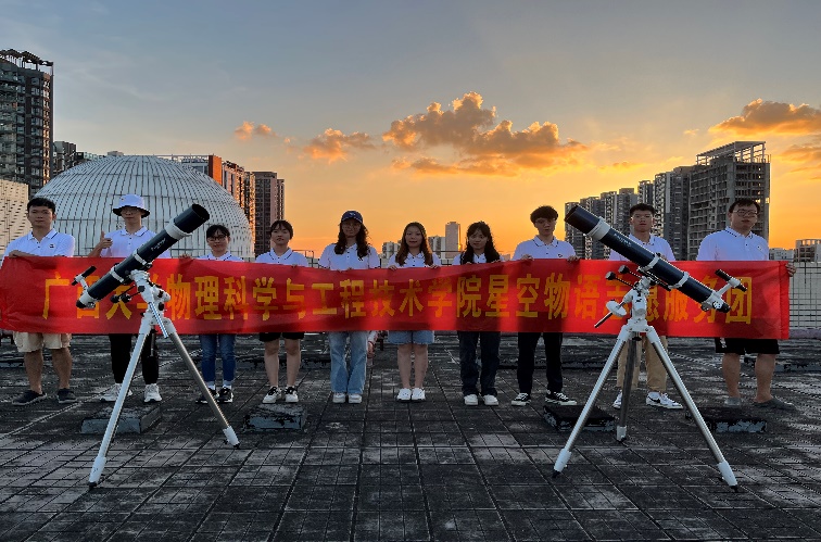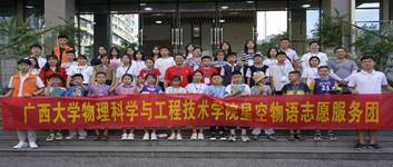 综合赛事平台星空物语志愿服务团成立于2020年,在学院党委的领导下,依托学院天象馆和专业优势,一方面旨在鼓励学生拓宽视野,树立远大理想,坚定“四个自信”,把立德树人根本任务融入到社会实践中去,另一方面积极践行志愿精神,彰显青年使命担当。该志愿团队获得广西大学“优秀志愿服务项目”。