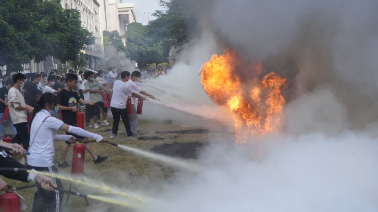 首先,保卫处黄光电老师在学院南侧空地讲授消防安全知识,并现场演示灭火器的正确使用方法。师生们在保卫处老师的指导下掌握了灭火器使用的相关技能,进行了消防灭火演练。