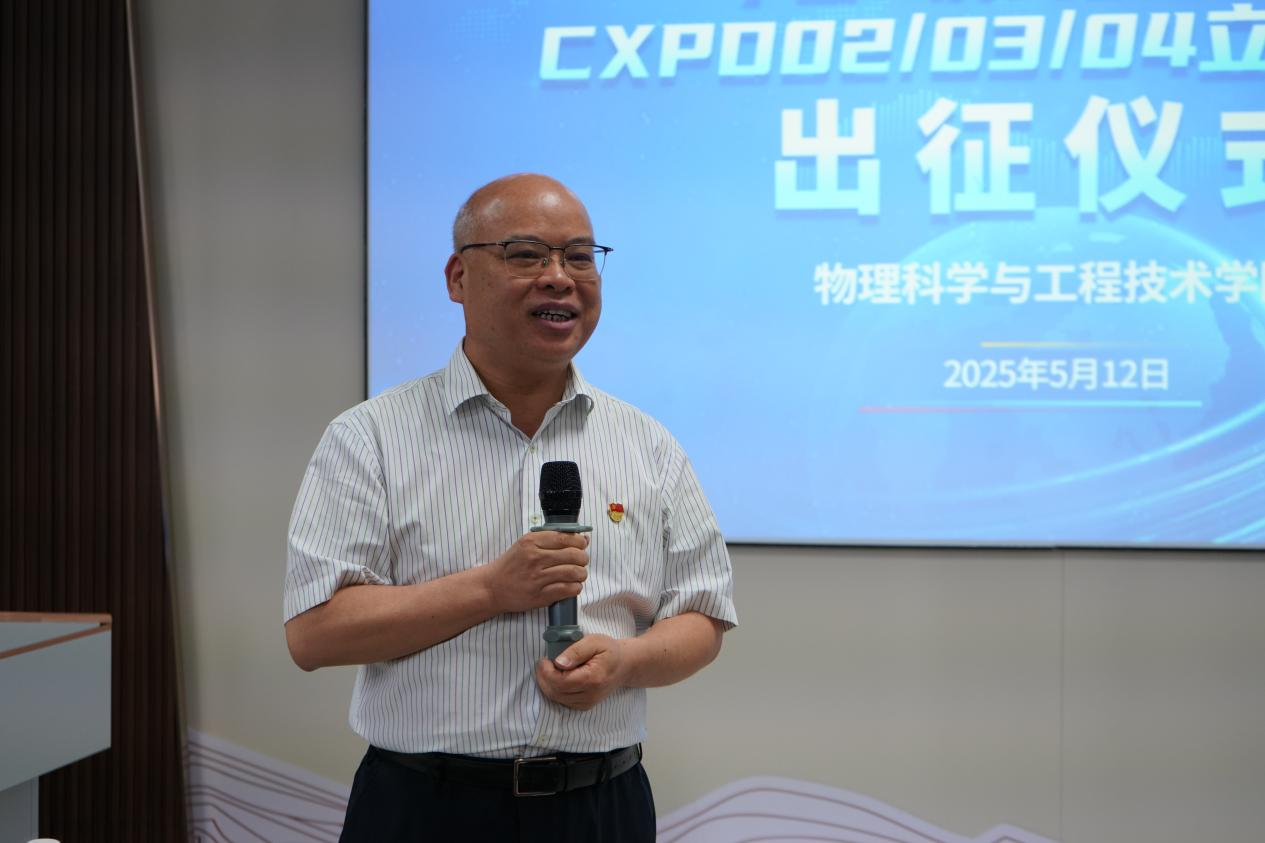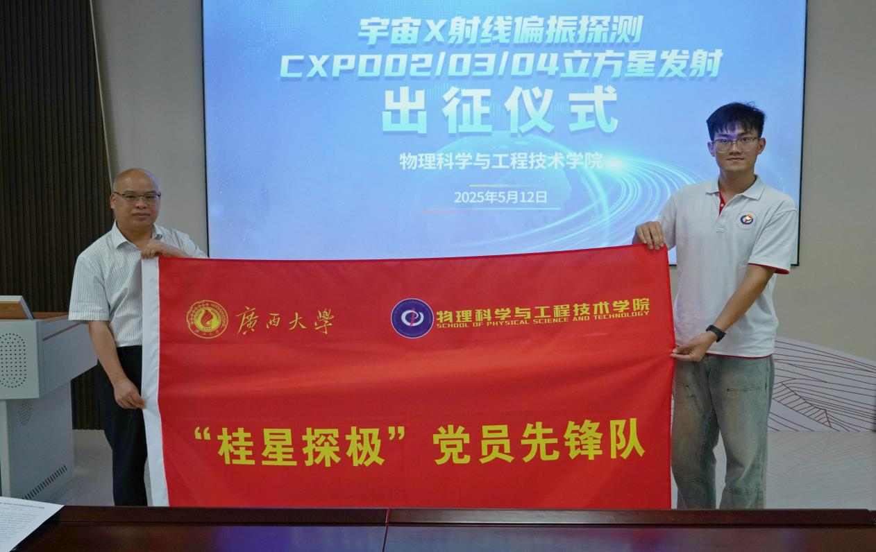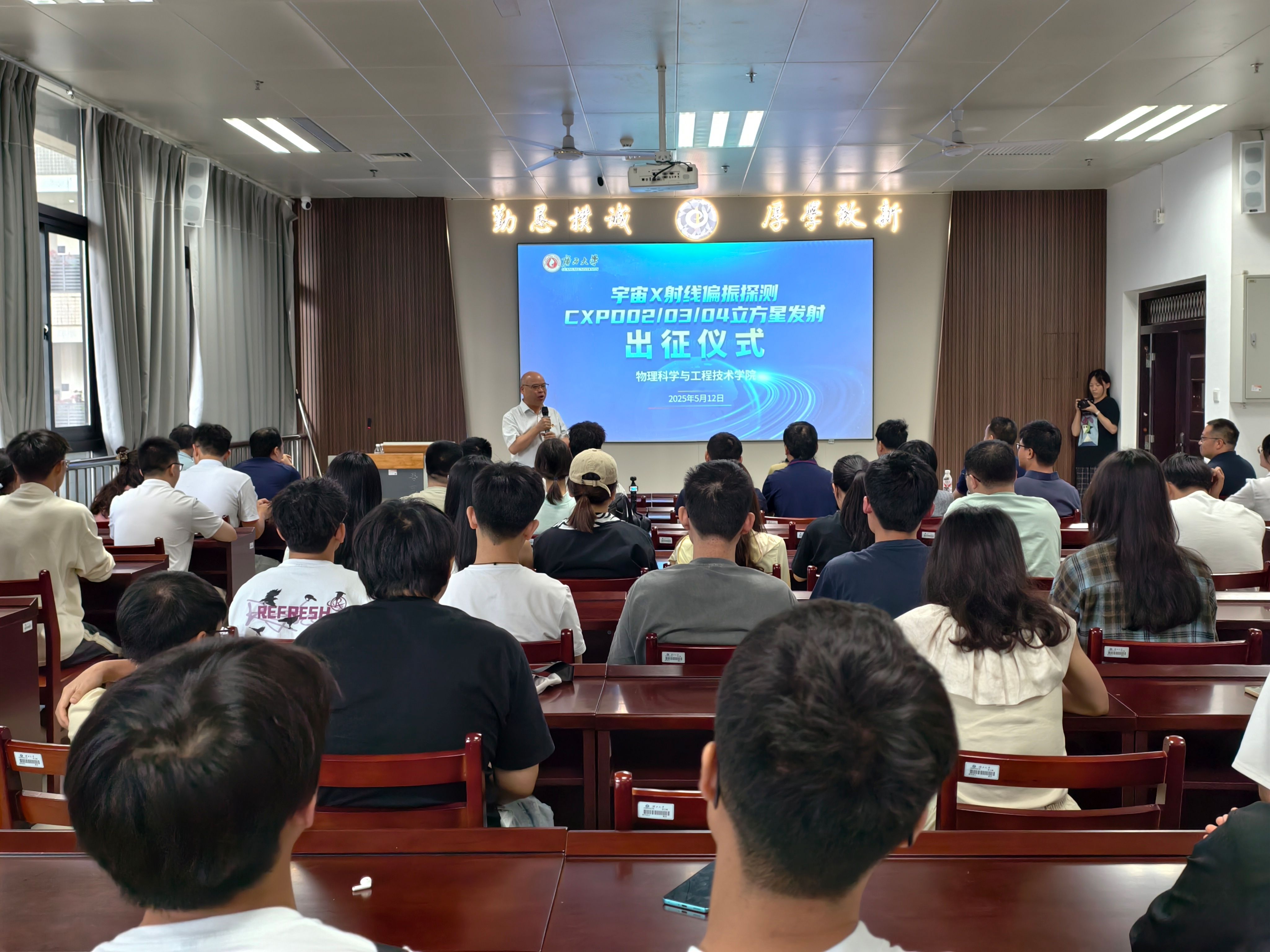 5月12日,世界杯体育官方网站举行宇宙X射线偏振探测(CXPD)系列立方星发射出征仪式,为即将奔赴酒泉卫星发射中心见证发射任务的团队壮行。校党委常委、副校长梁恩维为出征团队授旗并讲话,物理科学与工程技术学院党委书记蒋津辉主持仪式。