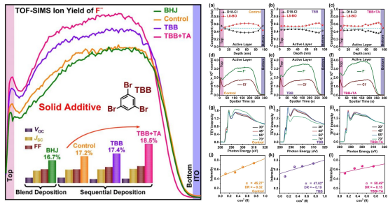 综合赛事平台薄膜光伏团队与韩国浦项科技大学Kilwon Cho教授等人利用具有高挥发性和低成本的1, 3, 5-三溴苯(TBB)作为受体溶液中的固体添加剂,并采用顺序沉积方法制备有机太阳能电池(Organic Solar Cells,简称OSCs)的光活性层,再结合热退火(TA)来调节由D18-Cl/L8-BO组成的OSCs光活性层中的垂直相分布。研究通过加入添加剂TBB,再结合热处理,在薄膜中形成长距离的分子填充和均匀的“双连续给体-受体”网络,从而提高薄膜的结晶度和在垂直方向上有利的供体-受体分布。研究中"TBB+TA"处理过的OSCs实现了18.5%(平均18.1%)的光电转换效率,VOC为910 mV,JSC为26.3 mA cm-2,FF为77.2%,优于其控制器件(17.2%,平均16.7%的光电转换效率)。器件性能的提高与激子生成速率、电荷载流子迁移率、电荷载流子寿命的增加以及双分子电荷重组的减少有关。该工作将先进的器件性能归因于垂直方向上梯度分布的给体-受体浓度,为优化顺序沉积的顶层形态以实现高性能有机太阳能电池提供了思路。