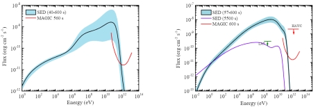 伽玛暴的甚高能余辉辐射对于研究伽玛暴喷流性质和暴周介质环境具有非常重要的意义。自2019年来该领域观测研究取得突破。2020年国际甚高能伽玛射线望远镜MAGIC观测简报报道了GRBs 201015A和201216C的100 GeV以上能区的伽玛射线余辉。博士生张璐璐和导师等人研究了这两个暴的辐射特征,发现GRB 201216C是一个极亮、能谱硬、辐射各项同性能极至今探测到最高红移(约1.1)的甚高能伽玛暴,与2022年探测到的至今最猛烈的伽玛暴GRB 221009A非常接近,而GRB 201015A是一个爆发总能偏低和能谱偏软的伽玛暴。他们基于标准的伽玛暴余辉模型拟合了射电、光学和X射线的多波段余辉光变曲线,给出了高能余辉辐射的谱能分布,发现两个暴的高能辐射均可电子同步自康普顿(SSC)过程揭示。基于这两个极端事例与至今观测到甚高能余辉伽玛暴的比较研究,他们发现这些暴不具有显著的共性特征,但均在3σ置信度水平内同样遵循Lγ,iso − Ep,z − Γ0三参量关系。