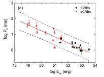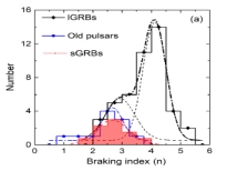 近日,综合赛事平台博士生邹乐等人在不同途径形成磁性质方面有新的发现,相关研究小组利用Swift卫星探测到伽玛射线暴数据研究大质量恒星坍缩及双致密星并合产生的磁星的性质,发现通过致密天体并合形成的新生磁星典型制动指数是3,而在大质量恒星塌缩形成的磁星的典型制动指数n~4,表明两类新生磁星的自转变慢分别主要由磁偶极辐射主导、引力波和磁偶极共同主导。前者途径形成的磁星表面磁场比后者的高一个数量级,而自转周期则比后者大一个数量级,但两者均遵循相同的自转周期与喷流辐射能量之间的关系,一个旋转速度更快的磁星能产生能量更高的喷流,这与它的形成方式无关。与超亮超新星(SLSNe)中的磁星和稳定脉冲星的性质进行比较,超亮超新星中的磁星表面磁场与大质量恒星坍缩形成的磁星还要低一个数量级,但是其自转周期基本一致,而致密天体并合形成磁星的制动指数与年老磁星比较吻合,自旋变慢均主要由磁偶极辐射占主导。
