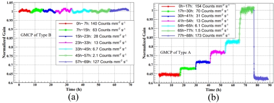 图(a)不同计数率的条件下氢还原的GMCP增益稳定性;(b)不同计数率的条件下未氢还原的GMCP增益稳定性。