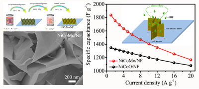 多金属氧化物材料由于其优异的电化学性能而获得了越来越多的关注。该工作采用两步水热法合成Ni-Co-Mo氧化物复合材料(NiCoMo/NF),并以垂直排列的纳米片阵列形式锚定在镍泡沫上。作为超级电容器电极材料,NiCoMo/NF电极具有1837.7 F/g(3.31 F/cm2)的高比电容和优异的循环稳定性能.基于NiCoMo/NF的混合电容器比能量高达41.1Wh/kg。优异的电化学性能源自于Ni-Co-Mo复合材料独特纳米结构、Ni-Co和Co-Mo氧化物之间的协同作用效应。该工作为多金属氧化物材料的制造提供了一种实用的方法,并有望用于大功率储能装置。