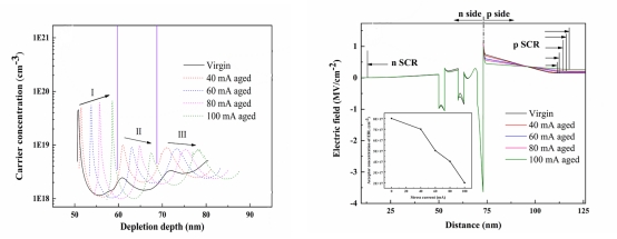 由于AlGaN基UV-LED 器件的仍然存在许多技术上的困难和不明的老化机制,这些限制了UV-LED 的寿命可靠性和迅速渗透市场的能力。目前由于UV-LED 老化的物理机制尚未完全确定,引起了广大UV-LED研究人员的极大兴趣。基于这一现状,我们通过I-V、C-V、功率测量和一维模拟系统地研究了265 nm UVC-LEDs在不同恒定电流应力下的老化机理。通过对比实验和模拟器件老化前后载流子的浓度变化,我们发现在不同电流应力下,电子阻挡层(EBL)受主浓度的变化,导致二极管p侧的不同耗尽宽度,而不是在之前的文献报道的简单n侧施主扩散过程。通过p-GaN材料表征验证了缺陷密度的增加。在较高的应力电流下,这两种机制都可能导致较低的空穴注入速率,这解释了与280 nm或更长波长的LED相比,265 nm的UV-LED更明显地退化。另一方面,我们的模拟结果也表明了量子阱内部的施主扩散过程,这两者都对进一步的光功率退化起着重要作用。因此,进一步提高EBL的稳定性和空穴注入率对商用UV-LED外延结构的设计具有重要意义。