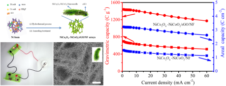 研发兼具高能量密度和高功率密度超级电容器的关键在于高性能电极材料的设计和开发。目前,NiCo2O4和NiCoO2由于具有较高的理论容量而备受关注。为改善金属氧化物的电化学性能,纳米阵列化和复合化设计是目前较为有效的制备策略。然而,两相共存的NiCo2O4/NiCoO2杂化电极材料的报道较少。该工作通过水热法和后退火法在泡沫镍上制备了NiCo2O4/NiCoO2/石墨烯杂化纳米阵列。其中,石墨烯对杂化纳米阵列的形貌和电化学性能产生了重要影响。在石墨烯的作用下,NiCo2O4/NiCoO2/的纳米阵列由许多纳米针自组装的团簇状阵列构成,为氧化还原反应提供了更多的电活性位点,为优异的电荷存储性能奠定基础。在1mA cm -1的电流密度下,该材料的比容量高达1439 C g-1,远大于纯的NiCo2O4/NiCoO2片状阵列的比容量(695 C g-1)。在60mA cm-2下,NiCo2O4/NiCoO2/石墨烯杂化纳米阵列仍保持1172C g-1的比容量(容量保持率为81.4%),展现了优异的倍率性能。此外,基于NiCo2O4/NiCoO2/石墨烯杂化纳米阵列的混合电容器器件的最大能量密度为34.3wh kg-1。研究结果表明NiCo2O4/NiCoO2/石墨烯杂化纳米阵列作为超级电容器的正极材料具有巨大的应用潜力,对超级电容器电极材料的制备与研究具有重要参考意义。