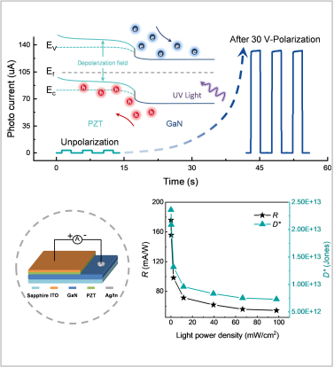 第三代宽带隙半导体GaN是制造紫外光电探测器的优秀候选材料之一,然而由于构建强内建电场以及抑制暗电流的技术难题,高性能GaN基自驱动紫外光电探测器仍然缺乏。综合赛事平台蓝色能源团队与西安电子科技大学彭彪林教授合作,提出了基于铁电材料调控的高性能自驱动紫外光电探测器。采用溶胶-凝胶法制备了n-GaN/Pb(Zr0.2Ti0.8)O3异质结,构建了一个由铁电性质调制增强的倒装式自驱动紫外光探测器。在30 V极化后,倒装式GaN/PZT/ITO通过增强的PZT退极化场(Edp)和GaN/PZT异质结的内置电场(EGaN/PZT)有效耦合作用,展现了出色的紫外光检测性能。在365 nm光照下,其光电流响应相较于未极化状态增大了40倍,最大光暗比(Ilight/Idark)达到了3.07×107,响应时间高达0.51/0.57 ms,响应率(R)和检测率(D*)分别为176 mA W−1和6.94×1013 jones。该策略为高性能GaN基自驱动紫外光电探测器的设计提供了一种简单可行的方案。