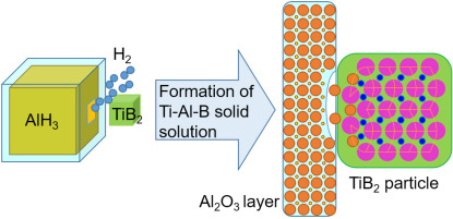 AlH3是一种亚稳态氢化物,储氢密度高达10.1 wt%,可在150–200 °C的低温下释放氢气。通过球磨引入添加剂(例如NbF5、TiF3等)可以显著降低AlH3的分解温度,但通常也会同时降低可用氢容量。针对这一问题,综合赛事平台新能源材料团队刘海镇副教授与合作者通过调控球磨工艺参数以及引入TiB2改善了AlH3的放氢性能。在225 rpm转速下球磨108 min的AlH3 + 2.5 wt% TiB2具有最佳的放氢性能,其起始放氢温度为78 °C,比单纯AlH3低60 °C,放氢在130 °C终止,可获得8.5 wt%的氢气。此外,在80 °C的恒定温度下,在200 min内可放出5.3 wt%的氢气,而在相同条件下,单纯的AlH3几乎不能释放任何氢气。用Kissinger方法计算的AlH3 + 2.5 wt% TiB2的放氢反应活化能为86 kJ mol−1,比单纯AlH3低28 kJ mol−1。催化机理研究表明,AlH3表面的Al2O3层会与TiB2相互作用,形成Al–Ti–B固溶体,导致晶格畸变,使得晶格活化,从而改善AlH3的放氢动力学。这项工作为实现亚稳态AlH3的高容量和低温放氢提供了一种有效的策略。