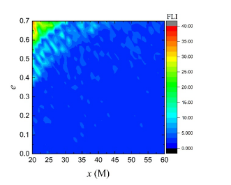 图二 双星系统的动力学特征。左上角混沌剧烈。