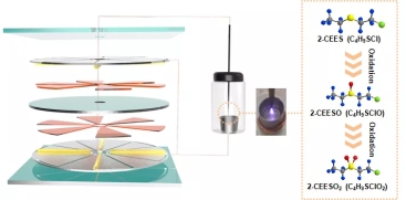 李舟团队制作了一个双层纸带旋转摩擦纳米发电机(dps-rTENG)作为一种自供电高压装置,在空气中诱导微等离子体处理芥子气模拟剂2-氯乙基乙基硫醚(2-CEES)。在微等离子体处理下,2-CEES的降解效率在2分钟内达到99%以上,dps-rTENG处理2-CEES的能量利用效率为0.520 μg/J,比商用电源高一个数量级。进一步的研究证实,dps-rTENG诱导的微等离子体的降解过程是可控的,可避免形成大量有毒的过度氧化产物2-氯乙基乙基砜(2-CEESO2)。摩擦电微等离子体为自供电、便携式CWAs降解系统提供了一种的新方法。该方法不仅适用于化学毒剂及其模拟剂的降解,同样可以适用于其他污染物。
