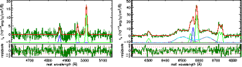 Fig. 1:Top panels show the best fitting results (solid red line) to the emission lines (solid dark green line), and bottom panels show the corresponding residuals. In top left panel, solid blue line shows the determined narrow H$\beta$, solid green lines show the determined [OIII] doublet. In top right panel, solid blue line shows the determined narrow Hα, solid cyan line shows the determined double-peaked broad Hα described by the elliptical accretion disk model, solid green lines show the determined [OI], [NII] and [SII] doublets, dashed purple lines show the determined broad Hα described by two broad Gaussian functions. In each bottom panel, horizontal dashed lines show residuals=0,±1, respectively.