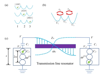 针对上述半导体量子点量子器件的电荷噪声优化调控问题,我们提出了一种基于三量子点设计的电荷量子比特。研究发现,将单电子囚禁在一个线性的三量子点电势阱之中(图a)形成的量子比特,单比特及两比特量子门均可以工作在对噪声不敏感的“甜点”(sweet spots)区域,获得高保真度的量子门操作。为了实现两比特量子门操作,我们还进一步设计了不同电荷比特与超导谐振腔的耦合(图c),利用谐振腔的滤波作用,电荷噪声可以进一步得到削弱。对于量子点-超导腔系统的共振及失谐区域,我们分别设计了两种经典的两比特量子门,即,“iSWAP”量子门及和乐量子门,理论计算表明,在现有噪声水平下,两种逻辑门的保真度均超过99%。