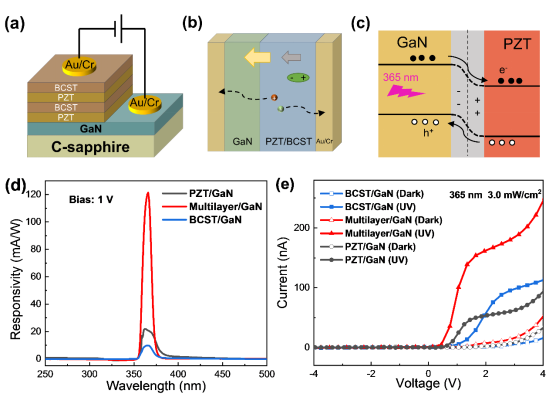 在光检测领域,铁电/半导体异质结构引起了越来越多的关注,这是因为铁电极化引起的界面电荷耦合。在这项研究中,我们利用溶胶-凝胶生长方法在(0001)GaN/c-蓝宝石衬底上制备了由Ba0.86Ca0.14Ti0.9Sn0.1O3和PbZr0.52Ti0.48O3交替层组成的薄膜,简称为BCST/PZT。我们的目标是研究这些薄膜对铁电/GaN异质结光电特性的影响。研究结果显示,BCST/PZT多层薄膜具有改善的铁电特性。此外,在1 V至3 V偏压范围内,多层结构的光电性能明显优于单独的BCST/GaN或PZT/GaN结构。值得注意的是,多层薄膜/GaN器件在1 V偏压下表现出121.4 mA/W的响应度和1.44×1011 Jones的探测度。研究发现表明,铁电材料中存在的去极化电场可以有效地与p-n结中的内建场和其他内部场相互作用,从而实现高性能光电探测器的实现。该研究提出了一种可靠的策略,用于开发高性能的铁电/GaN光电探测器。
