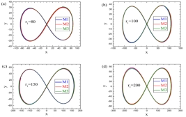 论文考虑了三种模型,即后牛顿拉格朗日近似运动方程(记为M1),后牛顿拉格朗日精确运动方程(记为M2),后牛顿哈密顿正则运动方程(记为M3)。在Imai, Chiba and Asada2007PRL98201102)的基础上对牛顿下八字形轨道的速度进行适当调整,使其满足在大的天体之间的分离距离下后牛顿模型得到反对称的八字形轨道。但对于小分离量时,这个速度的调整不再适用于这三种模型。我们通过轨道速度的扫描方法找到其分离量相对应的速度,说明三种模型下的八字形轨道对初始速度的敏感性非常强,任意一种模型的八字形轨道的速度都不适用于另外两种模型。
