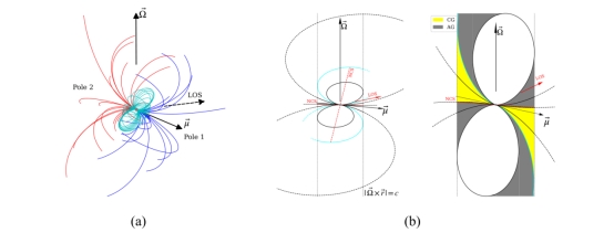 近日,以广西大学物理学院为第一单位,来自国家天文台、北京大学、贵州师范大学和中国科学院大学的研究人员,利用中国天眼FAST对全相位辐射的射电脉冲星B0950+08进行偏振观测,绘制出了脉冲星B0950+08的三维磁层结构和子午面辐射几何(磁轴和自转轴共面),如图1所示