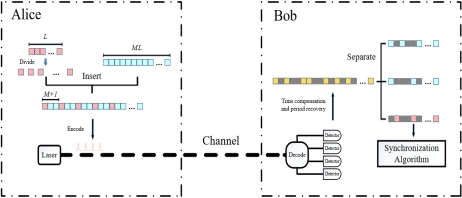本研究提出了一种基于量子比特的分布式帧同步方法(如图1所示),其中发送方将同步字符串周期性地插入随机编码序列中构成同步帧,编码并发送量子态。接收方利用接收到的量子信号的到达时间和测量结果等信息,通过执行同步算法实现系统的时间同步,同时提取安全密钥率。该方法中每帧都包含同步信息,由此可支持系统长时间连续运行,此外通过累积多帧探测事件,不需要增加同步字符串的长度来补偿信道损耗。