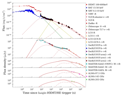 我们使用国际望远镜网络(LCOGT)观测的了伽马暴GRB 191221B的余辉(见图1),其光学余辉光变曲线在 10⁴ 秒附近变平,而同时期的X射线余辉没有变平,符合双成分喷流的特征。我们使用数值计算的方法计算的双成分喷流的余辉多波段光变,结果与观测值符合得很好(见图2)。