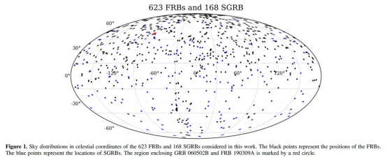 快速射电暴(FRB)是当前我们了解宇宙的最好的探针之一,是极短时标(毫秒量级)的射电波段脉冲,其物理起源目前仍然是不清楚的,但是与短伽马射线暴(SGRB)成协的磁星被认为可能是其中心引擎。我们对截止于20229月为止的所有精确定位的SGRB与所有的FRB源进行了一次系统的搜寻,希望能够找到成协的FRBSGRB。我们基于空间、时间以及距离的条件进行这次搜寻,发现仅有一组SGRB-FRB满足成协条件,即为GRB 060502BFRB 190309A,如下图的红点所示位置。
