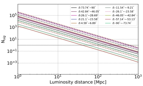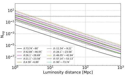 图4. 对于类似GRB 230307A的伽马暴的预期中微子事件数和距离的关系