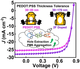 针对以上问题,综合赛事平台薄膜光伏团队与福建海峡实验室、韩国浦项科技大学合作,选择具有给体-受体-锚定集团的小分子材料2F来修饰PEDOT:PSS,通过提高导电性来克服界面层的膜厚限制。研究证实,2F小分子聚集在了ITO表面,形成了偶极层,从而改善了PEDOT:PSS的聚集方式,提高了电导率、增加了功函数,最终表现出了更好的电荷提取效率以及更低的漏电流密度。因此,2F修饰的PEDOT:PSS界面在基于PM6:Y6作为活性层的有机光伏电池中,实现了17.1%的效率,高于对照组器件的15.7%,效率的提升主要来源于由电荷提取导致的电流密度提高。而且,当进一步将界面层的膜厚提高到170nm后,以2F修饰PEDOT:PSS为界面层器件的效率仍然实现了超过15%的效率,体现了其优异的膜厚容忍性。利用1,3,5-三溴苯作为固体添加剂后,以2F+PEDOT:PSS为界面层的基于PM6:Y6、PM6:BTP-eC9、PM6:L8-BO器件的效率分别达到了18.3%、19.2%和19.1%。该研究揭示了通过小分子策略修饰空穴界面层来提高器件性能的有效性,对于有机光伏电池的产业化应用具有深刻意义。