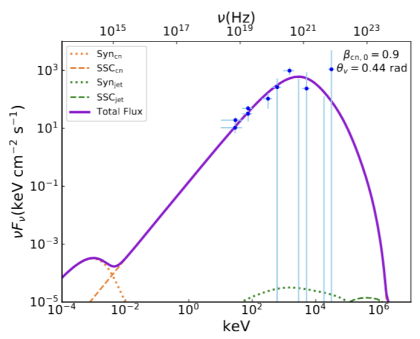 在 Wang et al. (2024) 的研究中,我们构建了参数化的 GRB 结构化喷流模型,并探讨了混合喷流茧(MJC)区域中剪切加速电子的辐射。研究表明,在正轴观测下,剪切加速电子与喷流核心激波加速电子的同步辐射(Syn)和同步自康普顿辐射(SSC)相互叠加,可成功解释某些GRB瞬时辐射的能谱特征。