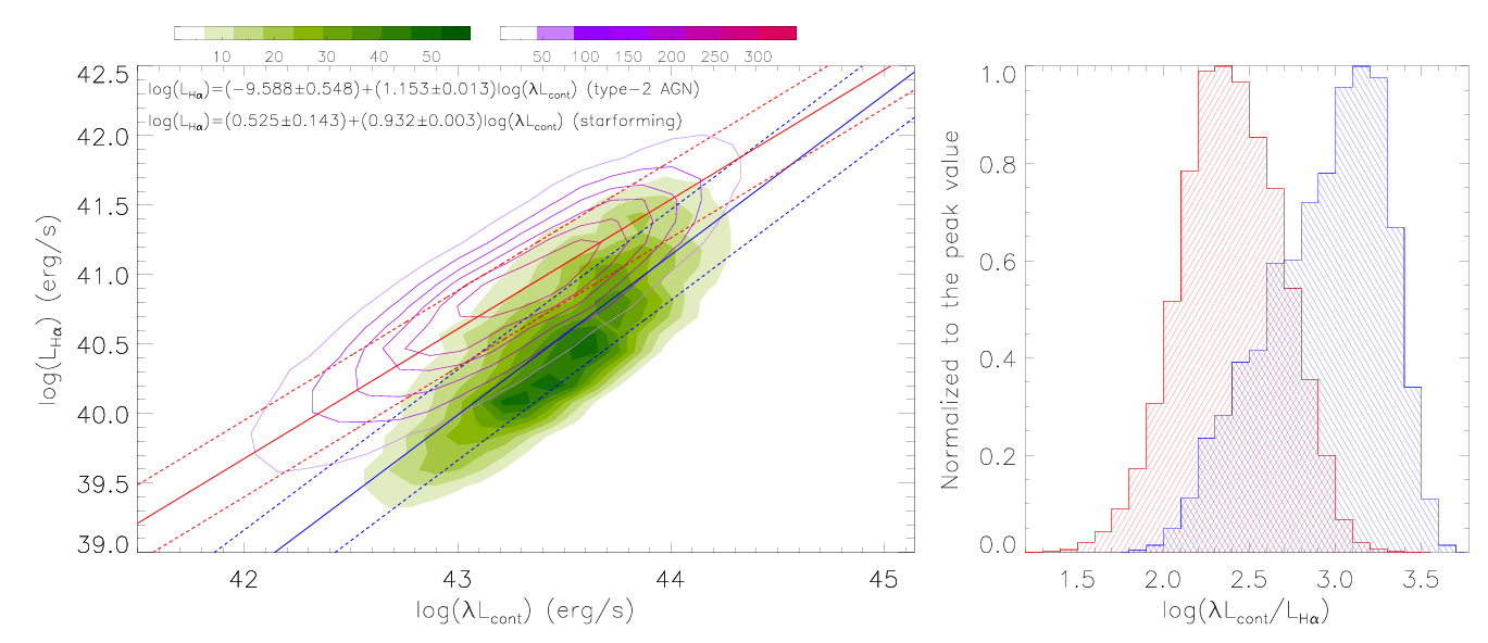 Fig. 1: Left panel shows the dependence of Hα luminosity on continuum luminosity for HII galaxies (in reddish color) and for Type-2 AGN (in greenish color). Right panel shows the distributions of luminosity ratio of Hα to continuum for HII galaxies (in red) and for Type-2 AGN (in blue).