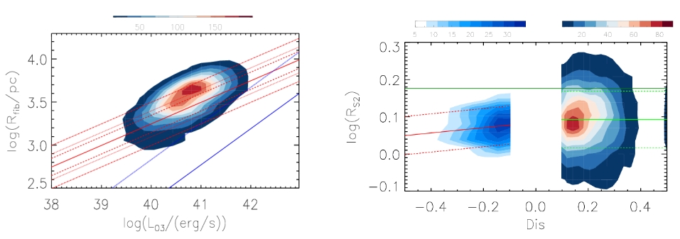 Fig. 1: Left panel shows the dependence of physical radius of SDSS fibers on [OIII] line luminosity. In the left panel, different line styles show results related to different R-L relations for NLRs. Right panel shows the dependence of flux ratio of [SII] doublet on distance.
