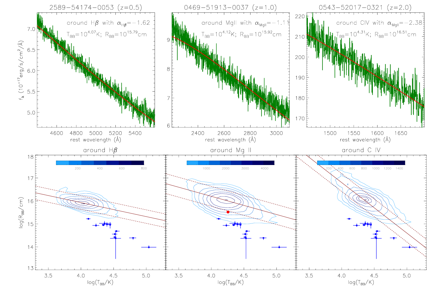 Fig. 1: Top panel shows the best descriptions to the continuum emissions in normal SDSS quasars. Bottom panel shows the properties of SDSS quasars and TDEs in the space of R – T. In bottom panel, solid circles in blue shows the optical TDEs, and contour for the results related normal SDSS quasars.