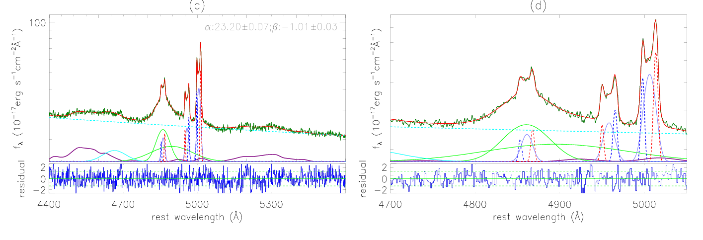 Fig.1 Best fitting results to the double-peaked narrow emission lines. In each panel, dashed lines in red and in blue show the double-peaked features in each narrow emission lines.